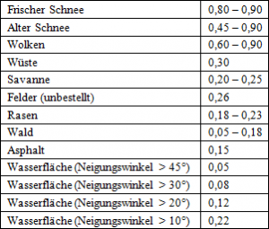 Die Albedo-Zahl gibt die Reflexion der Globalstrahlung an. Sie entspricht dem Verhältnis der reflektierten zur einfallenden Strahlungsintensität bzw. dem Verhältnis der auf- und abwärts gerichteten Strahlungsflussdichten.