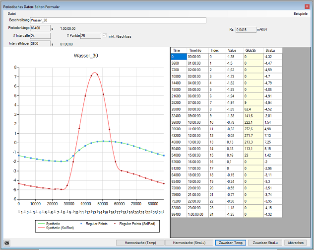 Die Tagesgänge der von SolRad berechneten solaren Bestrahlungsstärken (Globalstrahlungswerte in W/m^2) am Gebäudestandort können für den gewählten Tag für jede in AnTherm modellierte Orientierung aus SolRad exportiert werden.